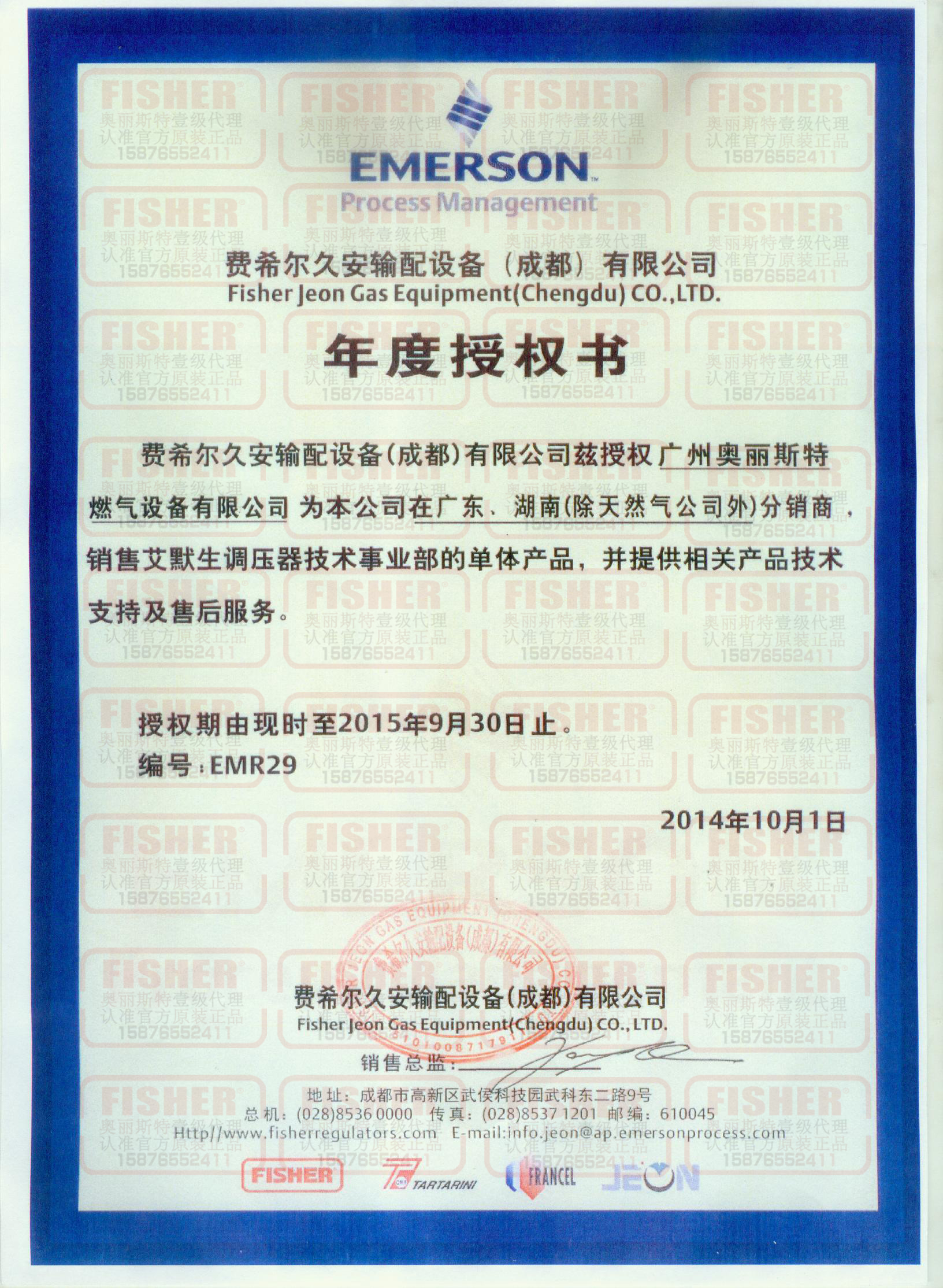 2015年度艾默生費(fèi)希爾代理證書-廣州奧麗斯特